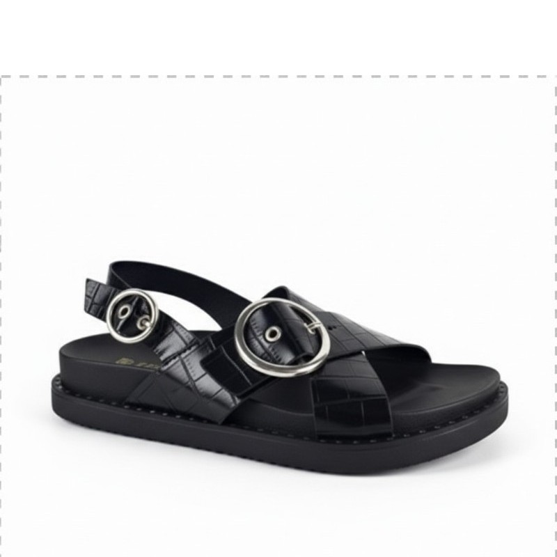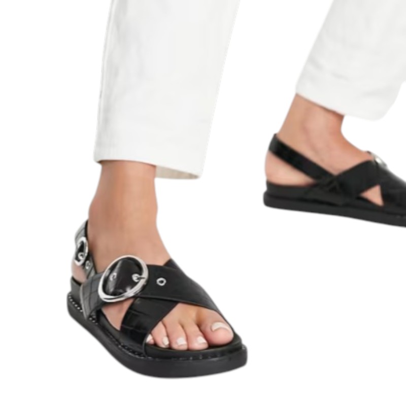 Το γυναικείο σανδάλι Glamorous σε μαύρο χρώμα είναι η ιδανική επιλογή για δυναμικές και μοντέρνες εμφανίσεις. Διαθέτει χιαστί λουράκια με ανάγλυφη υφή croco-effect που προσδίδουν ιδιαίτερο στυλ, ενώ οι μεγάλες ασημί αγκράφες και τα διακοσμητικά τρουκς γύρω από τη σόλα δημιουργούν ένα edgy και fashion αποτέλεσμα. Το ρυθμιζόμενο λουράκι στον αστράγαλο προσφέρει σταθερή εφαρμογή, ενώ η chunky flatform τρακτερωτή σόλα ύψους περίπου 3,7 εκ. χαρίζει άνεση και σταθερότητα στο περπάτημα. Κατασκευασμένο από ποιοτικό συνθετικό υλικό (faux leather), αποτελεί μια stylish επιλογή για καθημερινά καλοκαιρινά outfits.