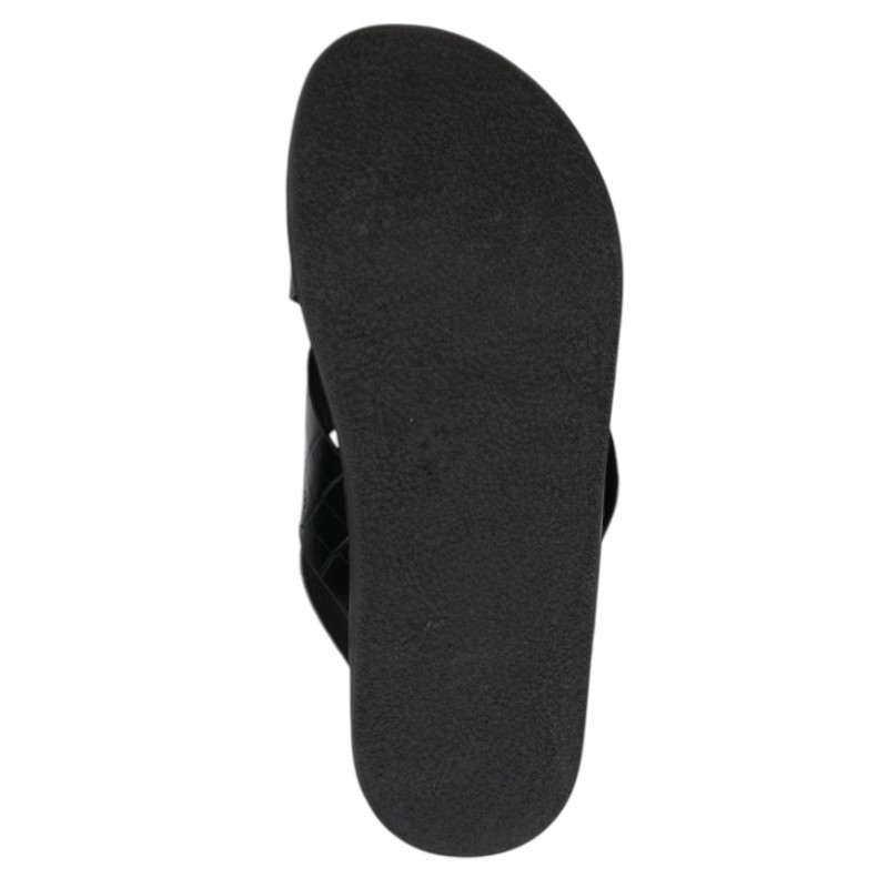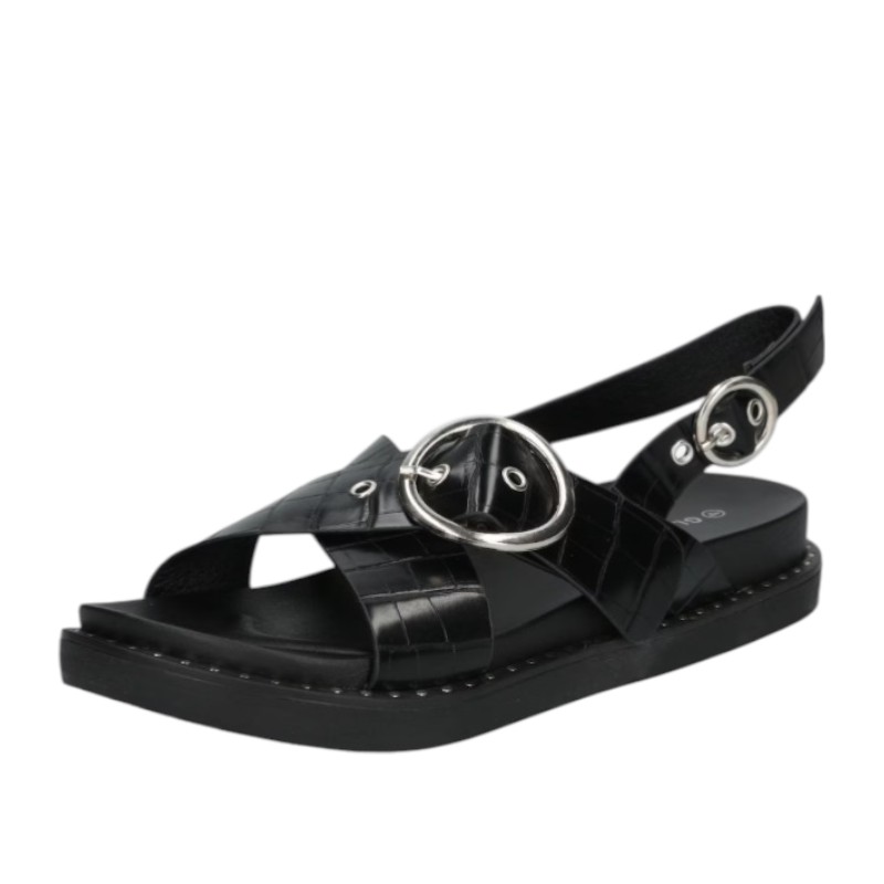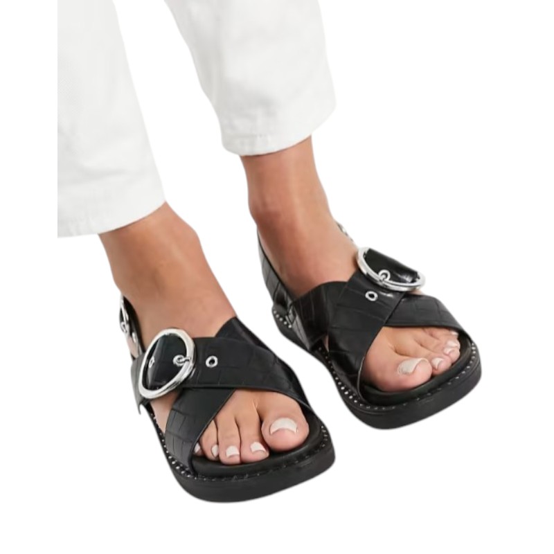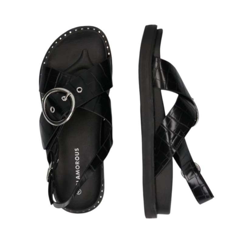 Γυναικείο μαύρο σανδάλι Glamorous με χιαστί croco-effect λουράκια, ασημί αγκράφες και διακοσμητικά τρουκς στη σόλα. Διαθέτει άνετη chunky flatform σόλα 3,7 εκ. και ρυθμιζόμενο λουράκι στον αστράγαλο για σταθερή εφαρμογή.