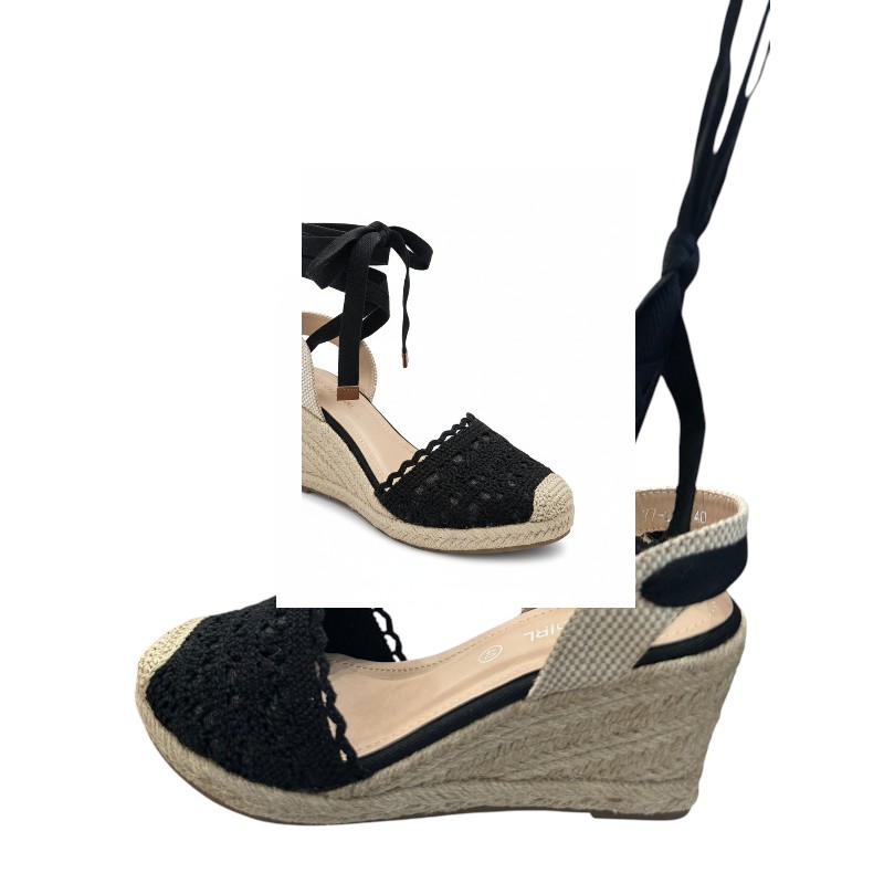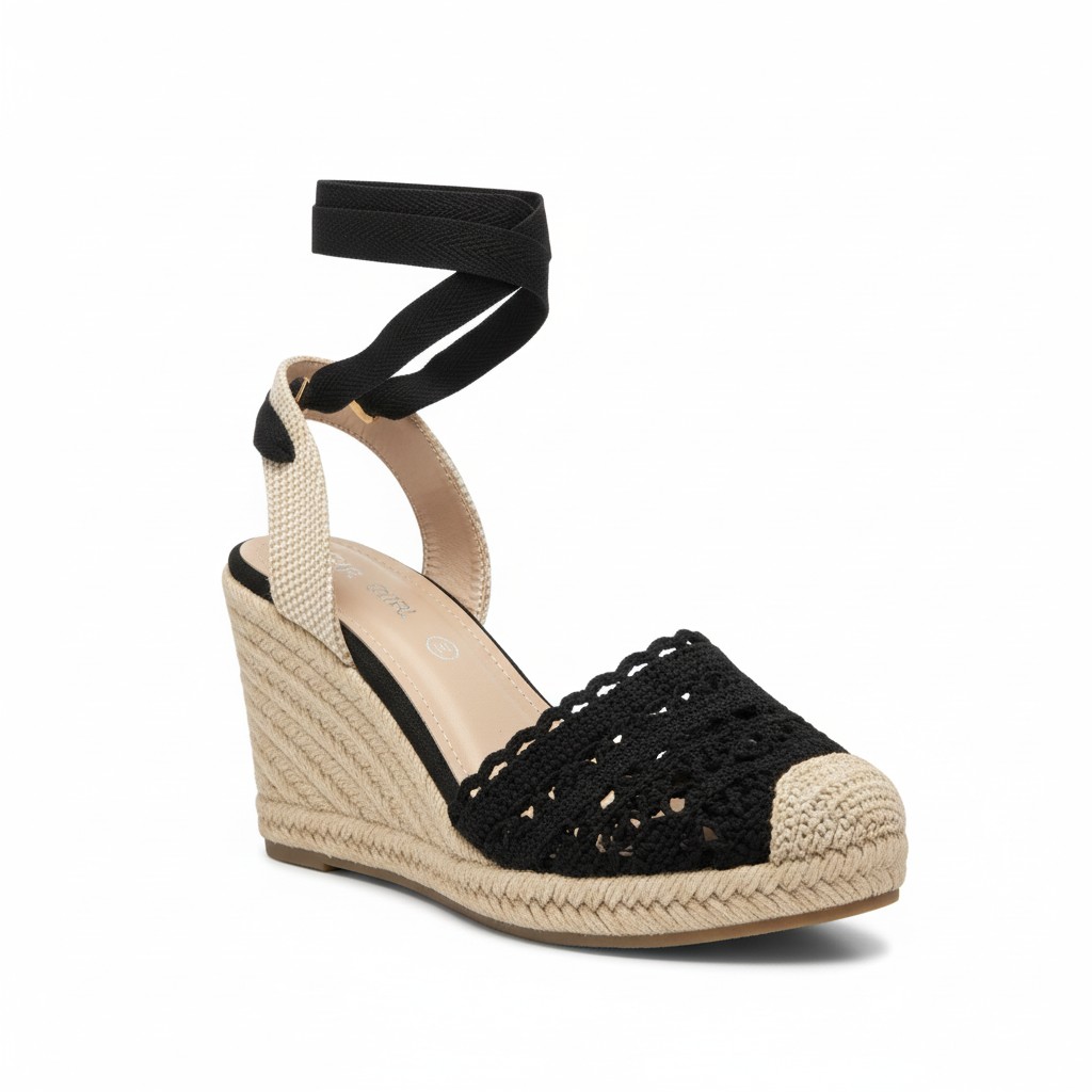 Εντυπωσιακές γυναικείες εσπαντρίγιες με πλατφόρμα που συνδυάζουν κομψότητα και καλοκαιρινή άνεση. Το μπροστινό μέρος διαθέτει μαύρη πλεκτή φάσα τύπου crochet, προσφέροντας μια θηλυκή και ιδιαίτερη αισθητική που ξεχωρίζει. Η σόλα είναι επενδυμένη με γιούτα (σχοινί), στοιχείο που χαρακτηρίζει τις κλασικές εσπαντρίγιες και χαρίζει φυσικό, καλοκαιρινό στυλ. Διαθέτουν κορδόνια που δένουν ψηλά στη γάμπα ή στον αστράγαλο, επιτρέποντας να προσαρμόζονται στο πόδι και να δημιουργούν κομψές εμφανίσεις. Ιδανική επιλογή για ανοιξιάτικες και καλοκαιρινές βόλτες από το πρωί έως το απόγευμα, προσφέροντας σταθερότητα, άνεση και μοντέρνο χαρακτήρα σε κάθε σύνολο.