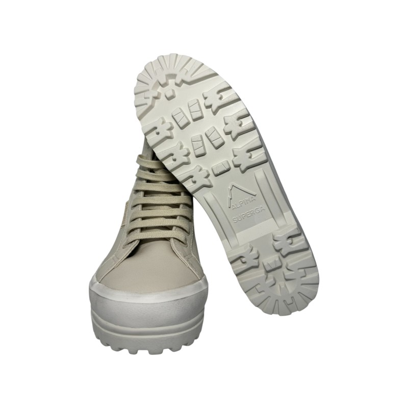 Πρόκειται για τα Superga. Αυτά τα μποτάκια από δέρμα νάπα και πλεκτό ύφασμα διαθέτουν τρακτερωτή σόλα από βουλκανισμένο καουτσούκ και ψηλό κόψιμο μέχρι τον αστράγαλο.
