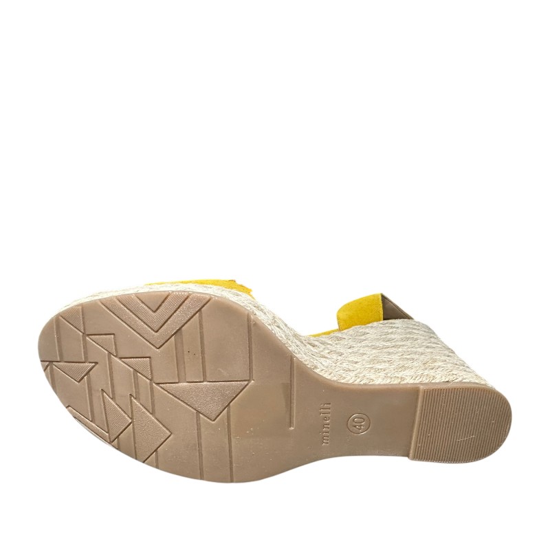 Γυναικείες δερμάτινες πλατφόρμες Barba F93-216/VEL της Minelli σε κίτρινο σουέτ, με λουράκι αστραγάλου και ψηλό τακούνι 12 εκ. Κομψή επιλογή που χαρίζει ύψος και στυλ σε κάθε καλοκαιρινή εμφάνιση.