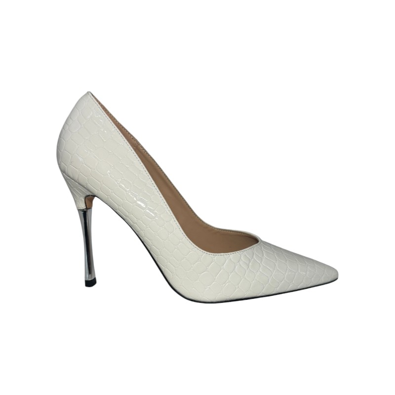 Το παπούτσι είναι μια λευκή γόβα στιλέτο με μυτερή μύτη, υφή από ανάγλυφο δέρμα κροκόδειλου και ασημένιο μεταλλικό τακούνι.