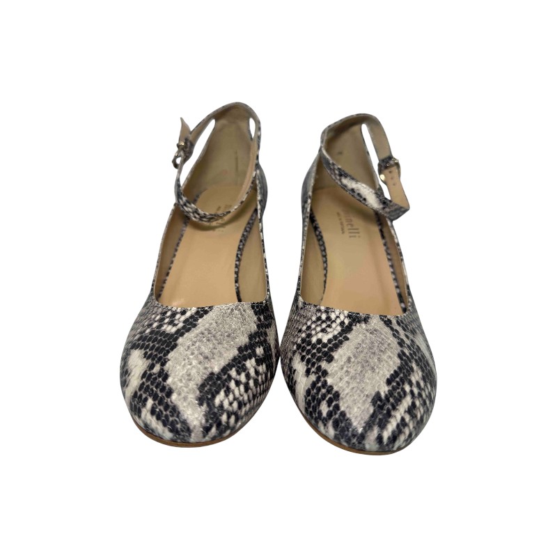 Πρόκειται για γόβες Minelli με λουράκι στον αστράγαλο και χοντρό τακούνι με σχέδιο από δέρμα πύθωνα ή φιδιού. Το συγκεκριμένο στιλ είναι γνωστό ως “escarpins avec brides en cuir naturel kimily” από τη Minelli.