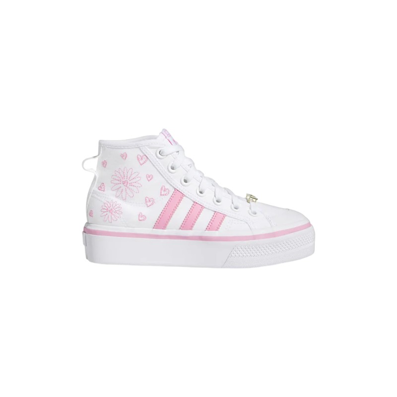 Φτάστε σε νέα ύψη με αυτά τα παιδικά παπούτσια adidas Nizza Platform Mid. Διαθέτουν υφασμάτινο επάνω μέρος με 3 ρίγες σε αντίθεση και σκίτσα με καρδιές και λουλούδια.